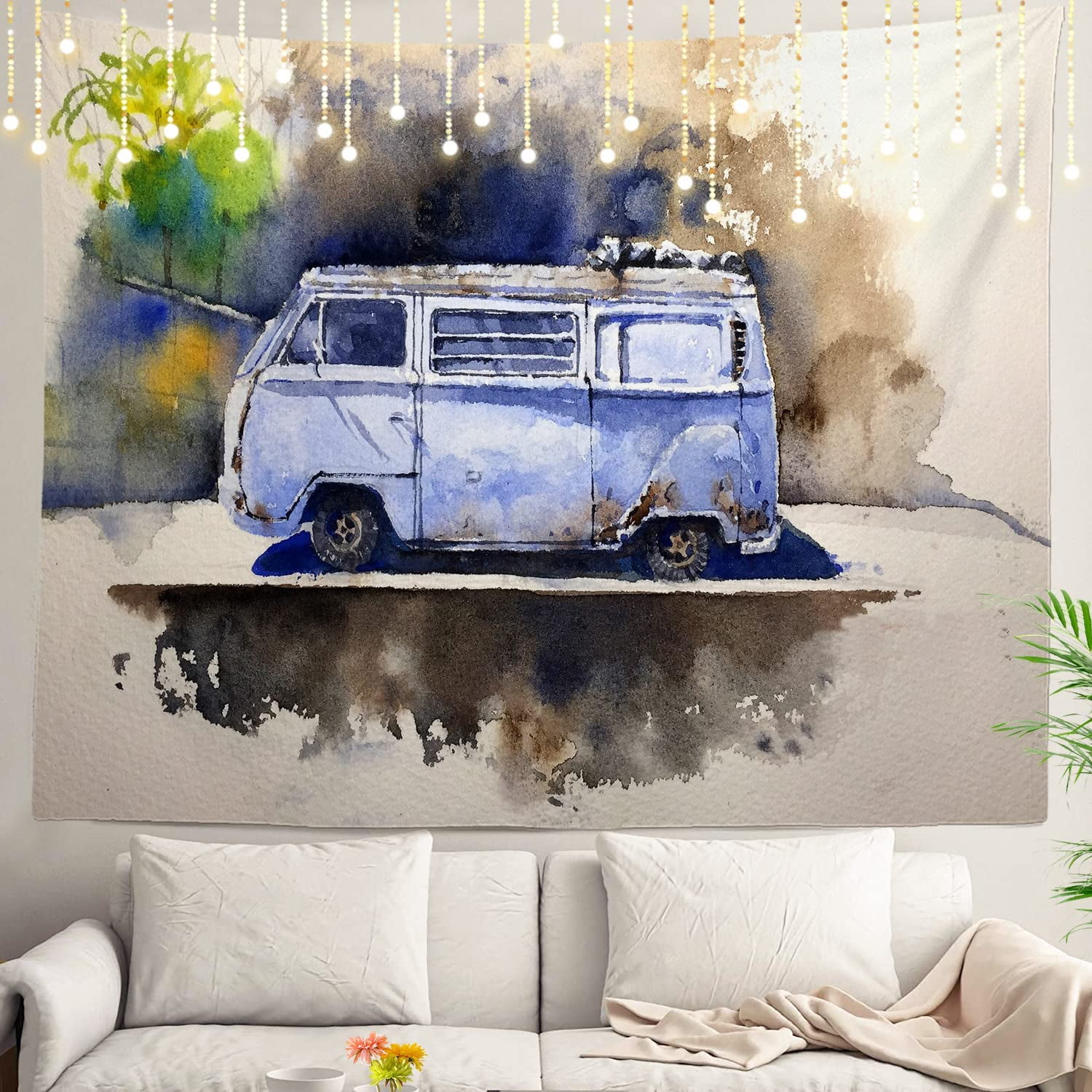 Pale Blue Watercolor Bus Wall Tapestry Retro Purplish Blue Painting Wall Hanging Large Tapestry Decoration Polyester Fiber White Hem Around For Dorm Room Bedroom 59 1 X 82 7 In Walmart Com